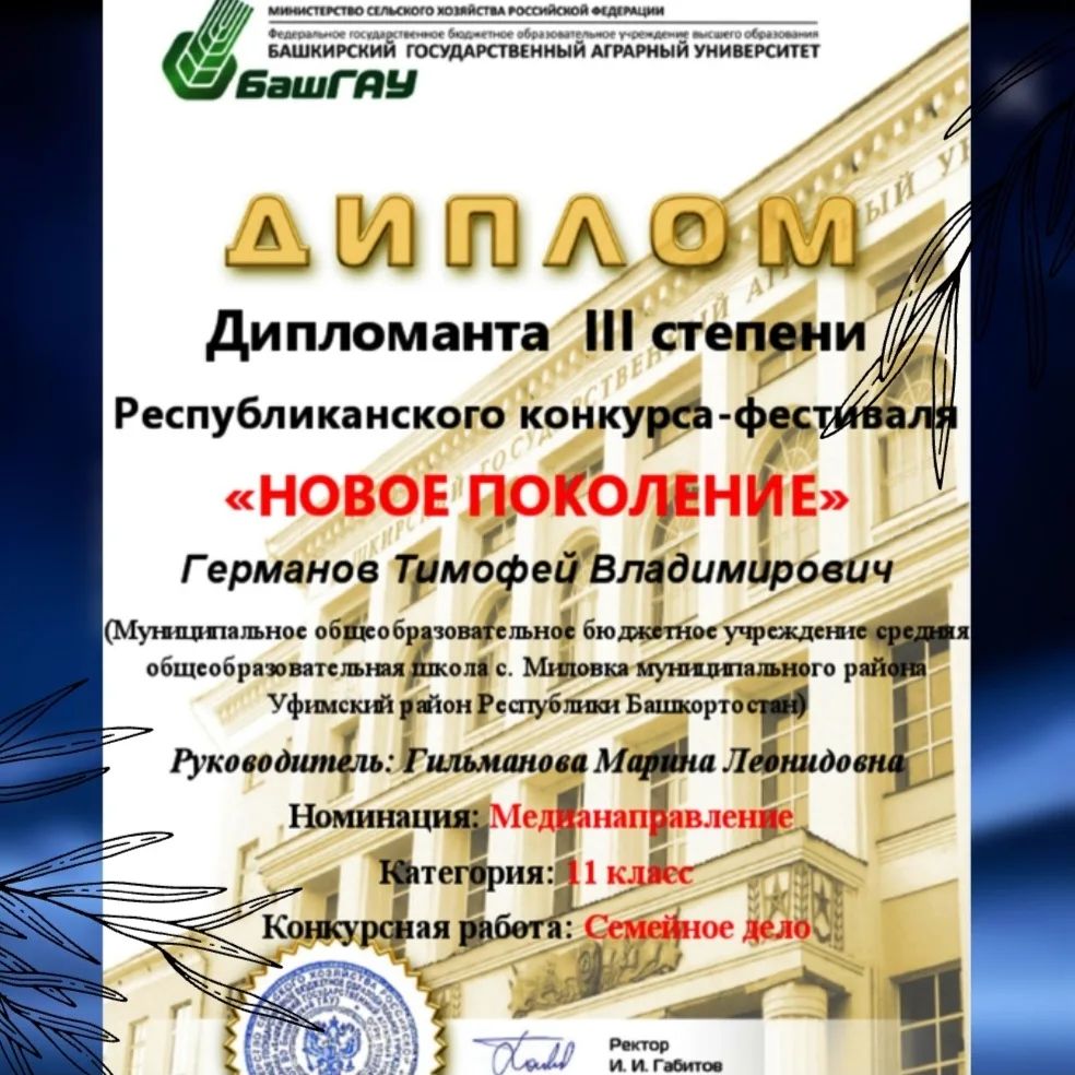 ✴️ За нашу школу в номинации Медианаправление успешно выступил ученик 11 класса Германов Тимофей с видеороликом «Семейное дело». Руководитель: Гильманова Марина Леонидовна.