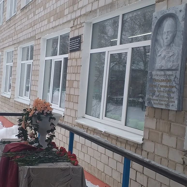 Сегодня, в День памяти о россиянах, исполнявших служебный долг за пределами Отечества, состоялось возложение цветов у мемориальной доски в честь Кильдиярова Артура Григорьевича, выпускника нашей школы, погибшего при исполнении воинского долга в республике Чечня 12 октября 2000 года.