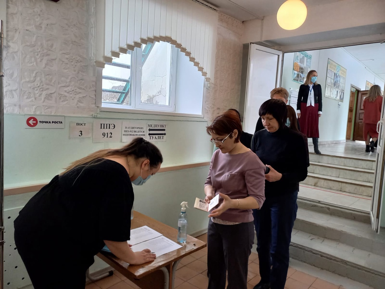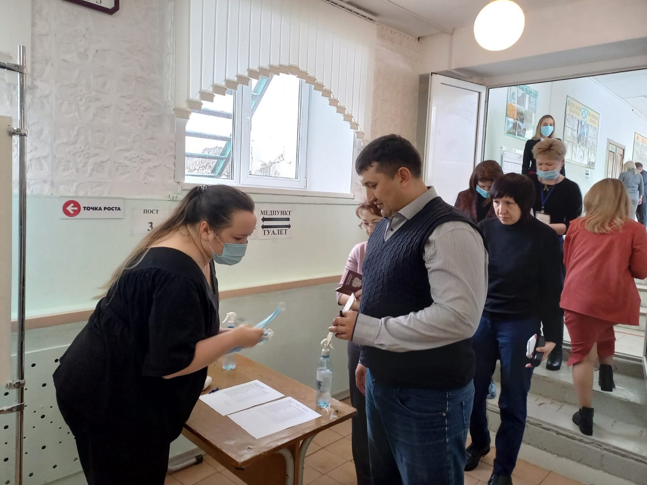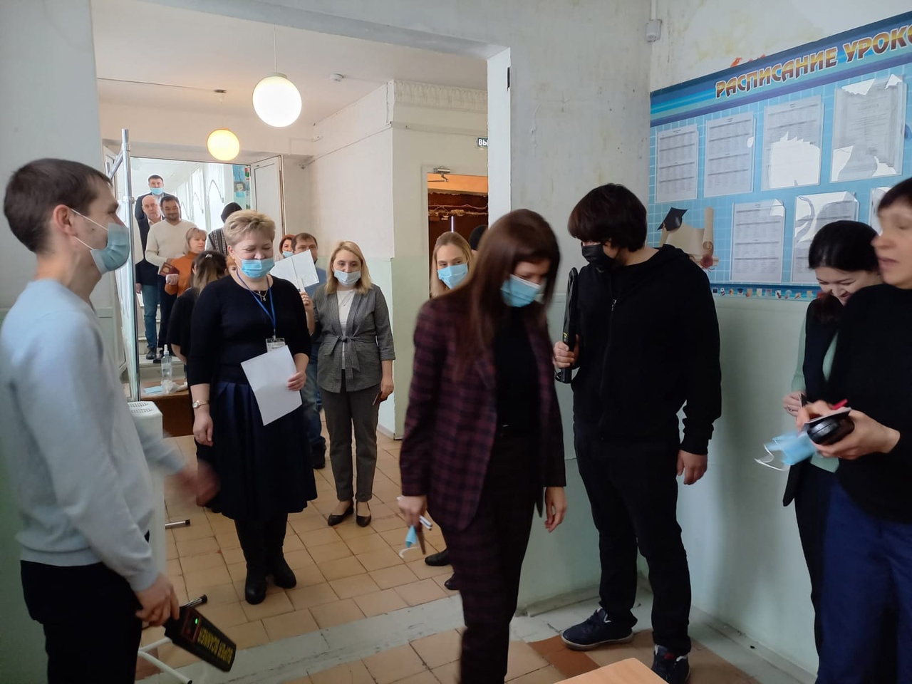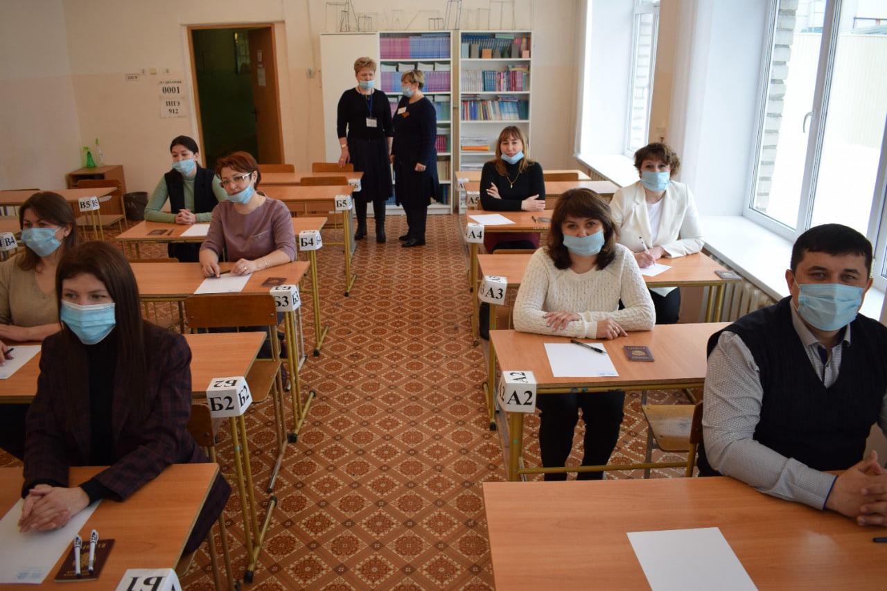 Взрослые полностью прошли всю экзаменационную процедуру: контроль на входе, регистрация, инструктаж и только потом - заполнение бланков.